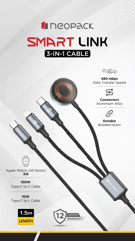 Neopack Smart Link 3IN1 Cable with USB-C, Lightning and Watch Connectors 100W Compatible with All Smartphones, iPhones, Tablets, USB-C Enabled Devices and Apple Watch (Black)