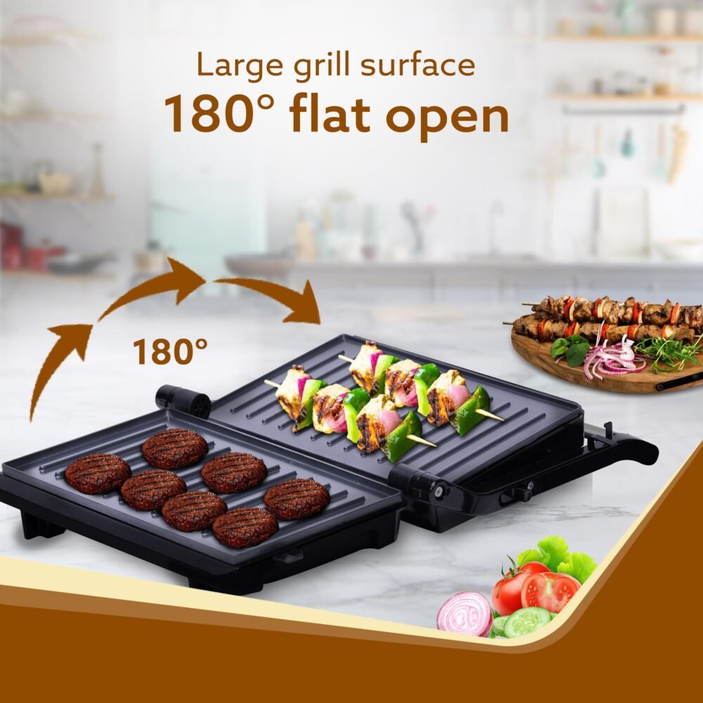 | Plates & Opening | Non-stick fixed plates; opens flat 180° to act as grill |