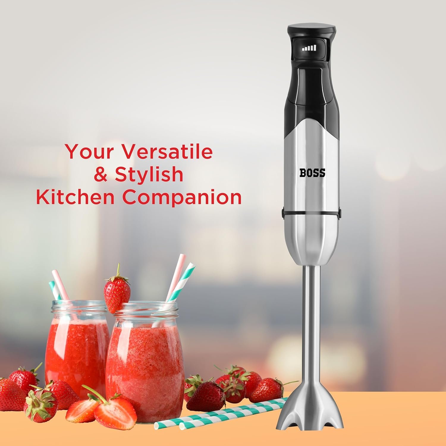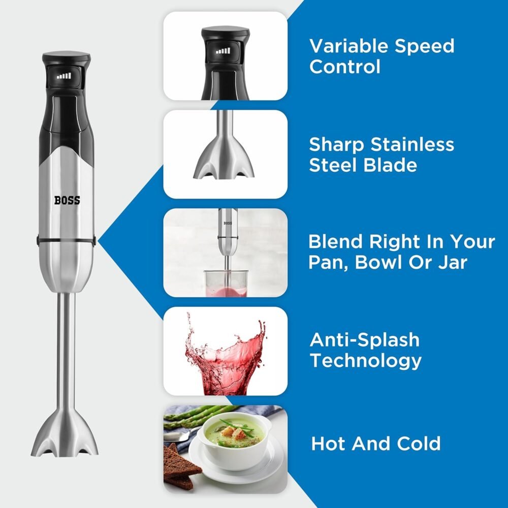 A high-performance hand blender with one-hand variable speed control, stainless steel cross blade, and HOTnCOLD compatibility for effortless blending.