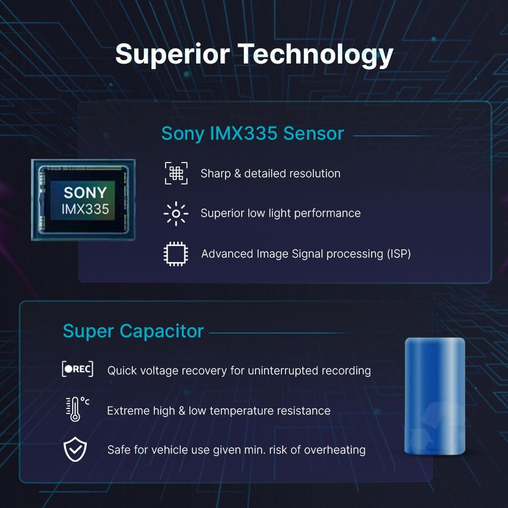 • High-Temperature Resilience: With a built-in supercapacitor, the dashcam withstands extreme weather conditions, ranging from -20⁰ C to 85⁰ C ensuring resilience in both cold and hot environments.