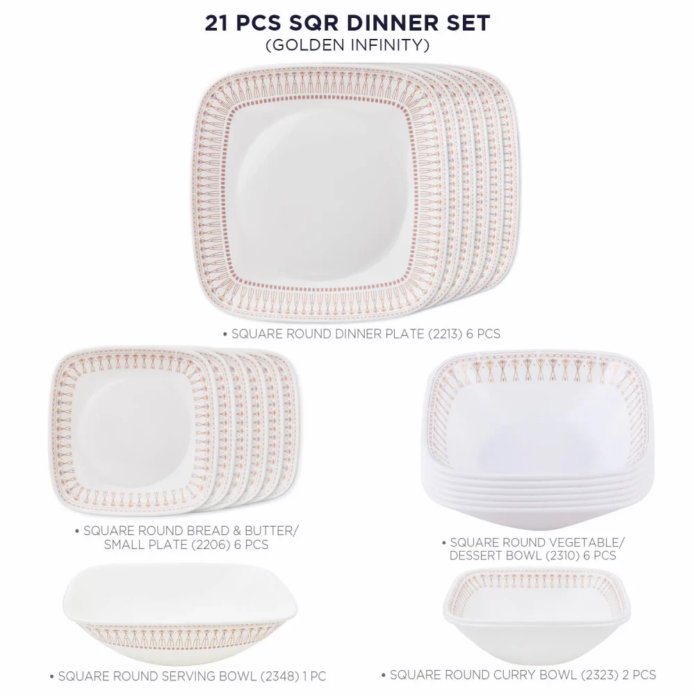 Bring happiness to your home with the elegant Corelle Golden Infinity Dinnerware Set. Designed to impress your guests, this luxurious multicolour dinner set adds a touch of sophistication to every dining occasion. Crafted from durable Vitrelle glass, it combines timeless beauty with unmatched strength.