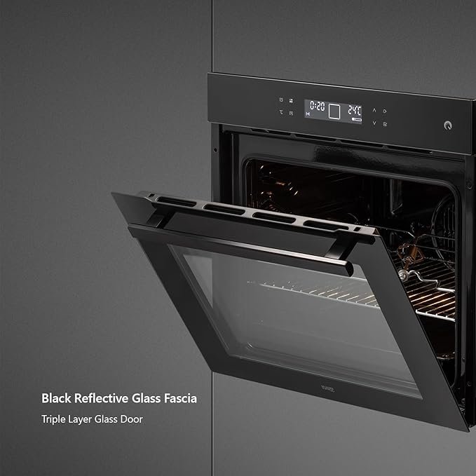 <p style=”text-align:center;”>Matte black built-in convection oven with Full Touch control, rotisserie feature, and auto defrost. Stylish, reversible door design with electric fuel system for modern kitchens.</p>