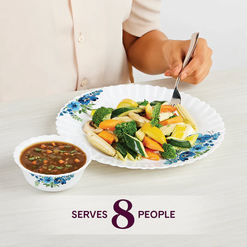 6 Full Plates, 6 Quarter Plates, 6 Veg Bowls, 6 Soup Bowls, 6 Spoons, 1 Rice Plate, 1 Serving Bowl, 6 Soup Plates, 1 M. Serving Bowl (860 ml), 1 Salad Bowl (1.2 L), 6 Katori Bowls, 6 Cups (140 ml), 6 Saucers, 8 Lids |