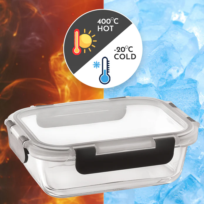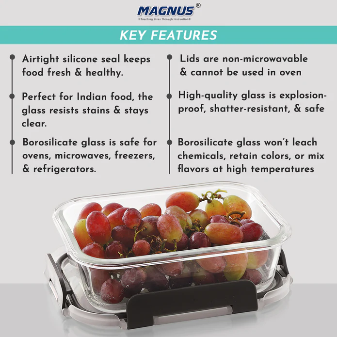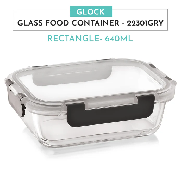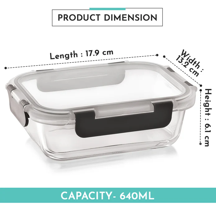 Magnus Glock Glass Food Rectangle Container with Break-Free Detachable Lock – Oven & Microwave Safe Borosilicate Glass 640ML – Lunch Box for Kitchen Essentials, Lunch Boxes for Office Men
