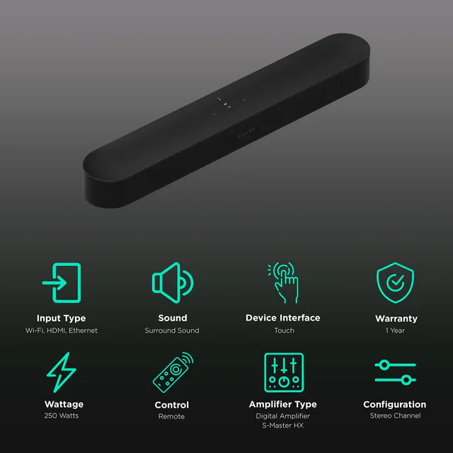 Sonos 2 Wireless , Wi-Fi Connect 250 W Bluetooth Soundbar (Black, Stereo Channel)