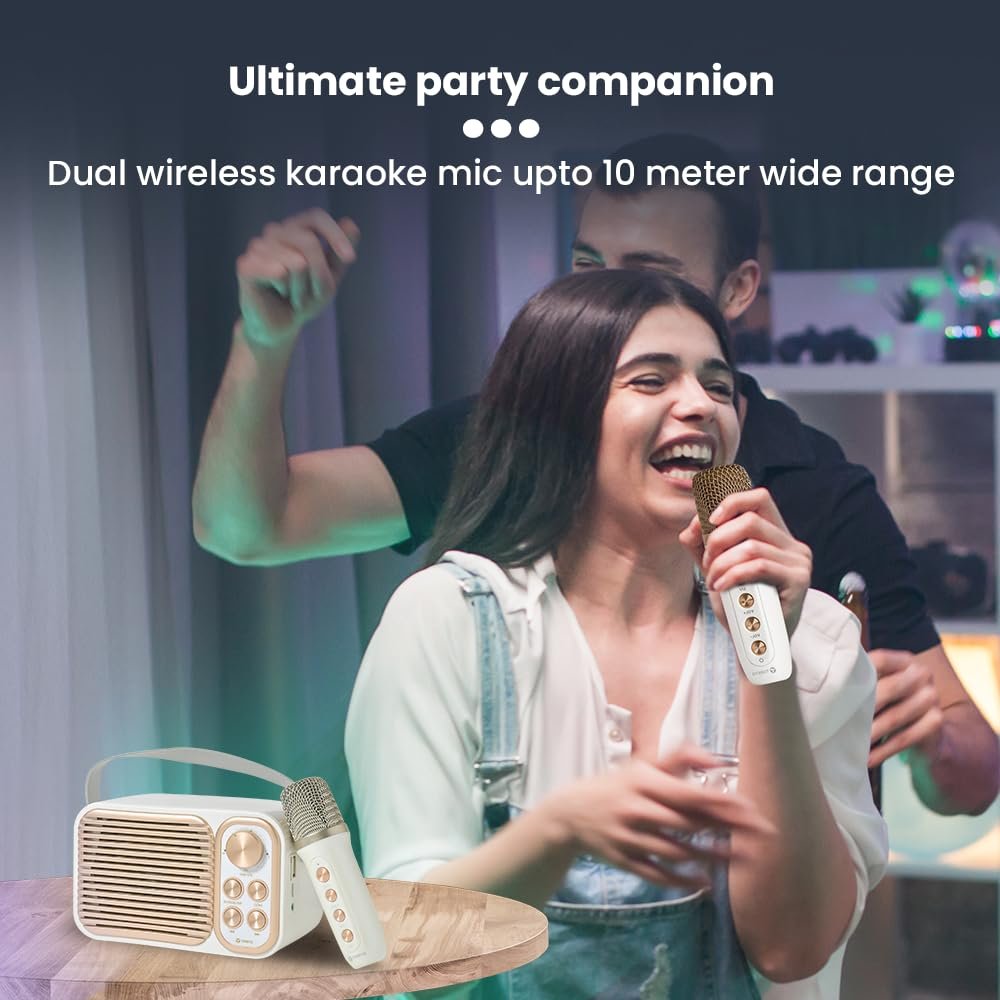 Box Contents Classic Retro Mini Speaker, Dual Karaoke Mic, Type C Fast Charging Cable, Warranty Card, User Manual